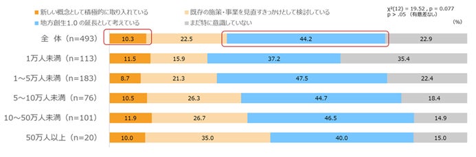 地方自治体における「地方創生2.0」への姿勢を尋ねた設問では、全体の44.2%が「地方創生1.0の延長として考えている」と回答し、最も多い結果となりました。一方で、「新しい概念として積極的に取り入れている」との回答は全体で10.3%にとどまっています。このように、全体的に「地方創生2.0」に対する受け止め方に温度差がみられるものの、χ²検定では人口規模による有意な差は確認されなかった(p=0.077)ことから、この温度差は自治体ごとの地域課題や施策状況に応じて生じている可能性が示唆されます。