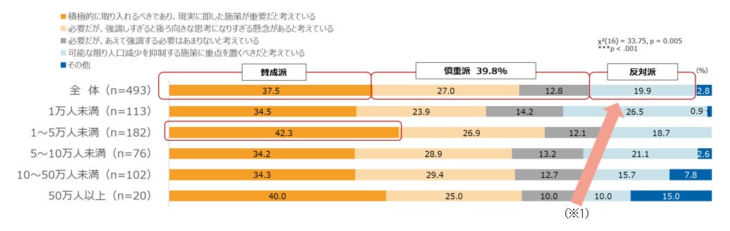 また、「可能な限り人口減少を抑制する施策に重点を置くべき」とする“反対派”も19.9%と一定数存在しています。特に、反対派の回答傾向には自治体規模による差がみられ、人口規模が小さいほど、人口減少を前提とした政策に反対する割合が高い傾向がみられました(※1)。