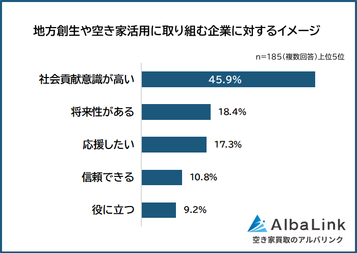 「地方創生や空き家活用に取り組む企業に対して抱くイメージ」を聞いたところ、1位は「社会貢献意識が高い(45.9%)」でした。以下、2位「将来性がある(18.4%)」、3位「応援したい(17.3%)」、4位「信頼できる(10.8%)」、5位「役に立つ(9.2%)」という結果でした。