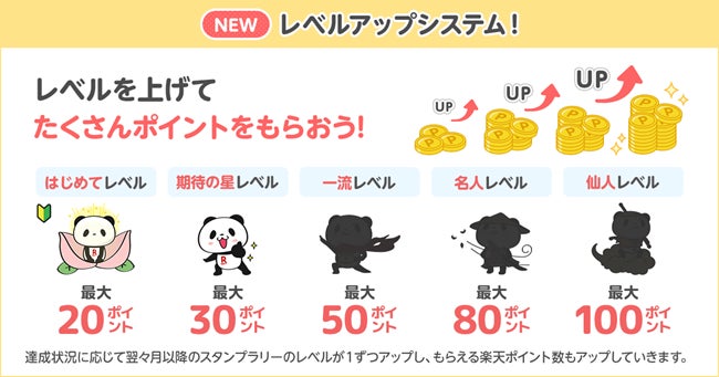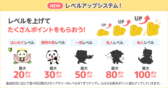概要 | スタンプラリーに参加し、各スタンプの条件を達成するとスタンプ帳にスタンプが押されます。期間中にスタンプを横1列(4つ)集めるごと及び全スタンプを集めた方に、レベルに応じた「楽天ポイント」を進呈します。 |
