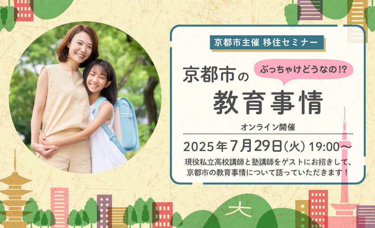 令和7年度の第2回移住セミナーは、「ぶっちゃけどうなの!?京都市の教育事情」と題し、昨今の移住シーンで耳にすることも多くなった「教育移住」をテーマに、京都市内で教育現場に身を置く方々をゲストにお迎えし、京都市の教育にまつわる様々な情報をオンラインでお届けします。