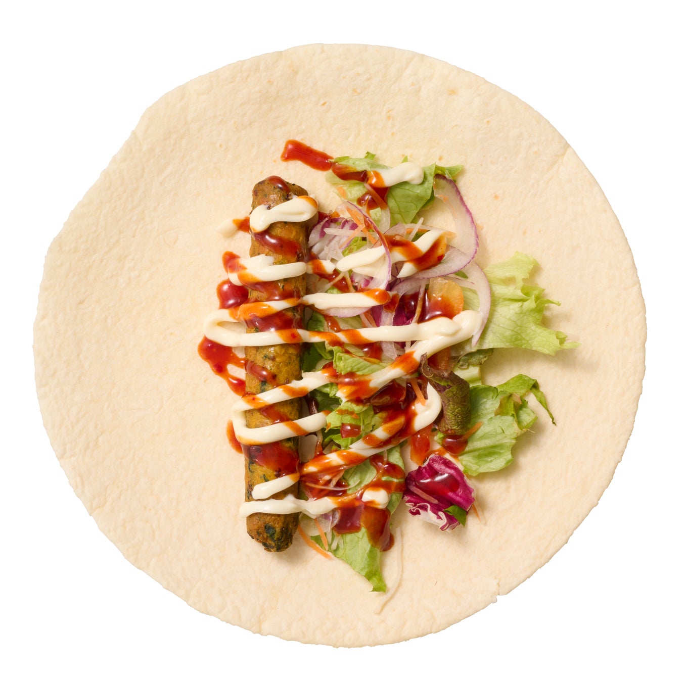 薄くて柔らかいシンブレッドに野菜で作ったベジソーセージ、レタス、オニオンを包み、旨辛のヤンニョムマヨソースで仕上げました。