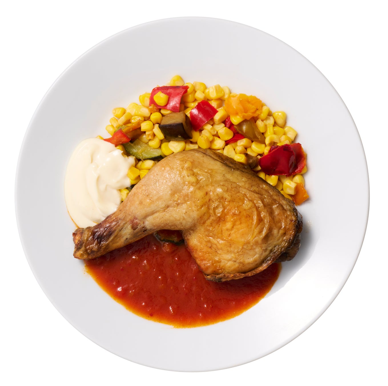 食べ応えのあるチキンのコンフィに、ピリッとしたスパイシートマトソースをたっぷりとかけました。マイルドなチーズと組み合わせることで、絶妙なバランスの味わいに。付け合わせには夏野菜とたっぷりのコーンを添え、彩りと食感のアクセントも楽しめる一品です。