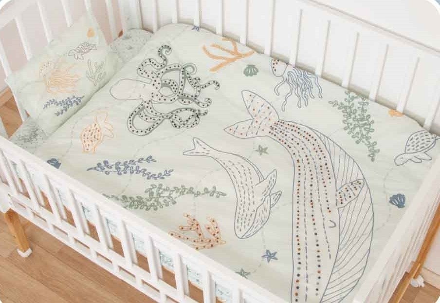 刺繍がかわいい海をモチーフにしたフリーケット。ブランケットやひざ掛け、お子様が遊ぶプレイマットなど、様々な用途で活躍し、1つあるだけでお部屋のアクセントになります。もちろん、上記の寝具5点セットと合わせてコーディネートをしてもかわいいアイテムです。ネットを使用して洗濯機で洗えるので、汚れても安心。