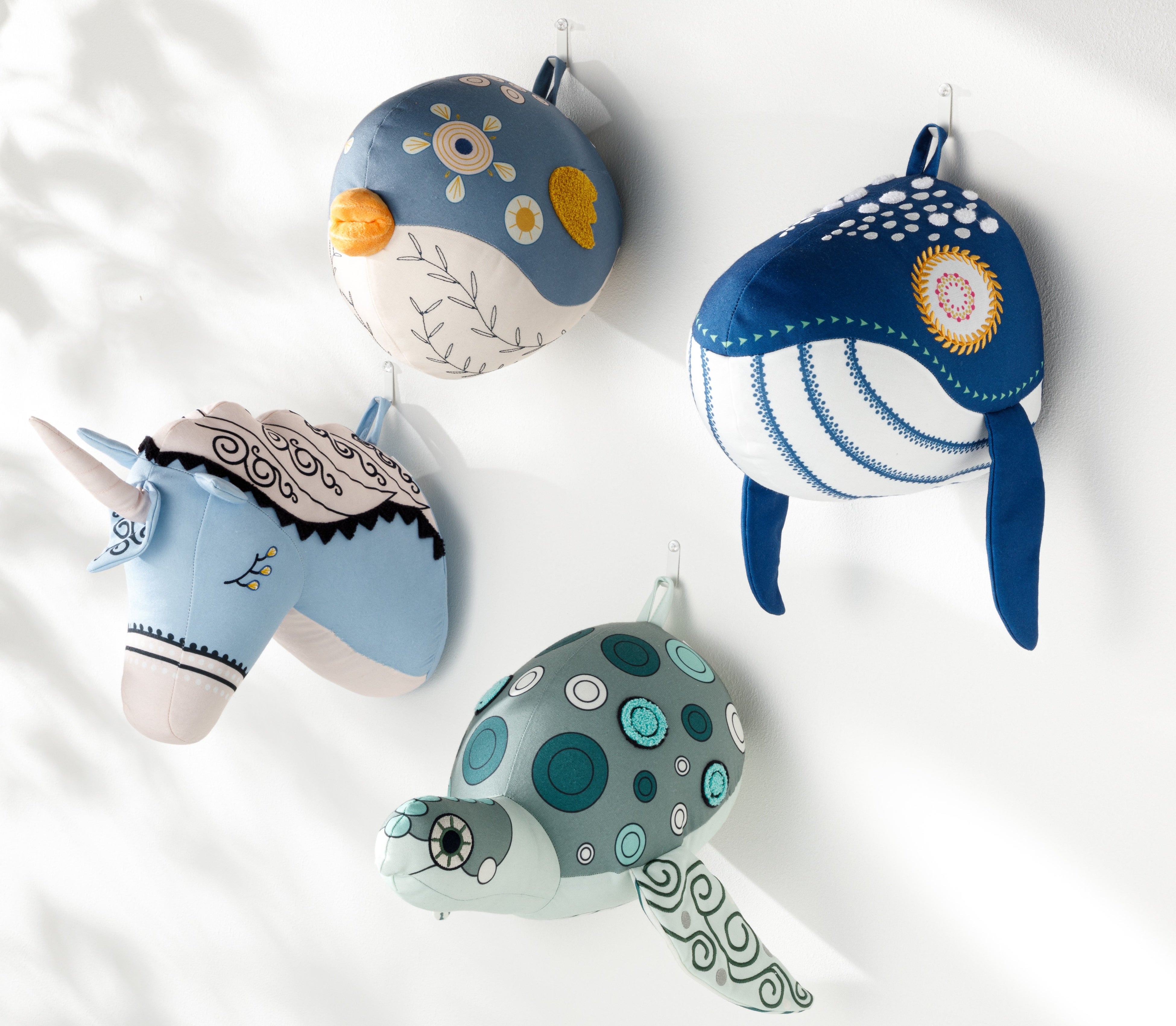 1つ1つ手縫いし立体感のある刺繍入りの寝具や、壁を彩るウォールデコレーションを追加。海の仲間たちが優しく空間を包み込みます。