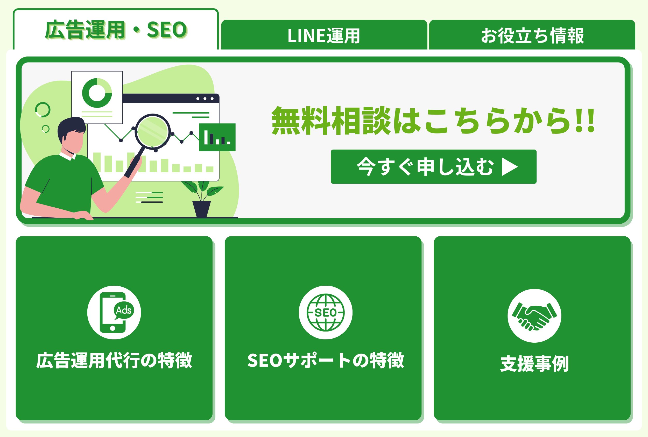 ・「広告運用」「SEO・コンテンツマーケティング」「LINE運用」「WEBコンサルティング」「HP・LP制作」「メディア事業」などLINEから直接ご相談、予約が可能