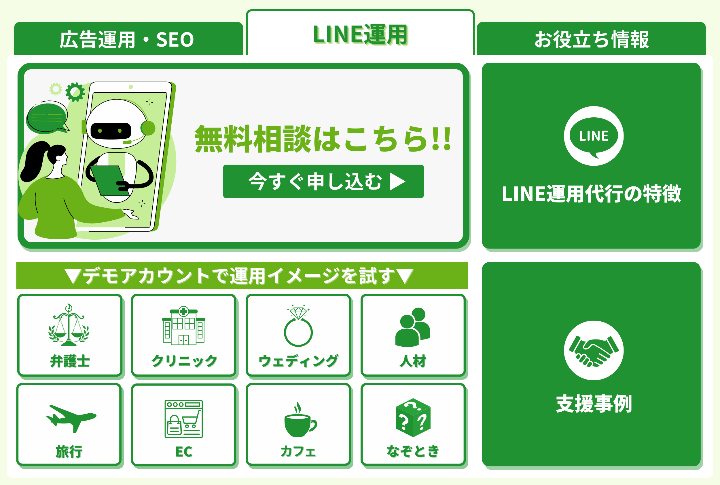無料相談や弊社の支援事例をLINE内で簡単にご覧いただけます。