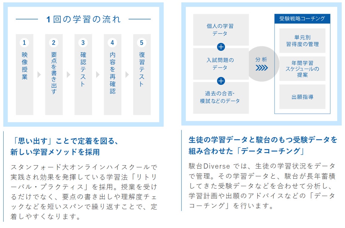 『思い出す』ことで記憶を定着させる学習メソッドや、長年蓄積されてきた受験ビッグデータをもつ駿台だからこそ可能なデータコーチングなど、大学受験生に必要な最先端の学習システムが利用可能です。