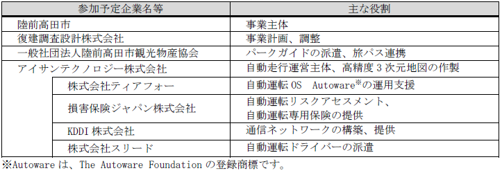 復建調査設計株式会社(本社:広島県広島市、代表取締役社長:來山 尚義)、一般社団法人陸前高田市観光物産協会(会長:熊谷 正文)、アイサンテクノロジー株式会社(本社:愛知県名古屋市、代表取締役社長:加藤 淳)、株式会社ティアフォー(本社:愛知県名古屋市、代表取締役社長:加藤 真平)、損害保険ジャパン株式会社(本社:東京都新宿区、代表取締役社長:白川 儀一)、KDDI 株式会社(本社:東京都千代田区、代表取締役社長 CEO:髙橋 誠)、株式会社スリード(本社:愛知県名古屋市、代表取締役社長:根本 喜行)の7者は、岩手県陸前高田市(市長:佐々木 拓)の委託を受け、2023年9月から、高田松原津波復興祈念公園 (岩手県陸前高田市) およびその周辺市街地において自動運転走行実証実験(以下 本運行)を開始します。