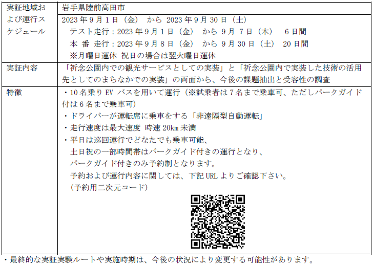 本運行は、2023年2月から3月に実施(注)した自動運転走行実証実験のルートに加え、「陸前高田市街地」までルートを拡大し走行します。土日祝日はパークガイドが車両に同乗する便も運行し、点在する東日本大震災に関連する施設を紹介します。従来までの「祈念公園内での観光サービスとしての実装」に加え、「祈念公園内で実証した技術の活用先としてのまちなかでの実装」を行い、両面から今後の課題抽出と受容性の調査を行います。