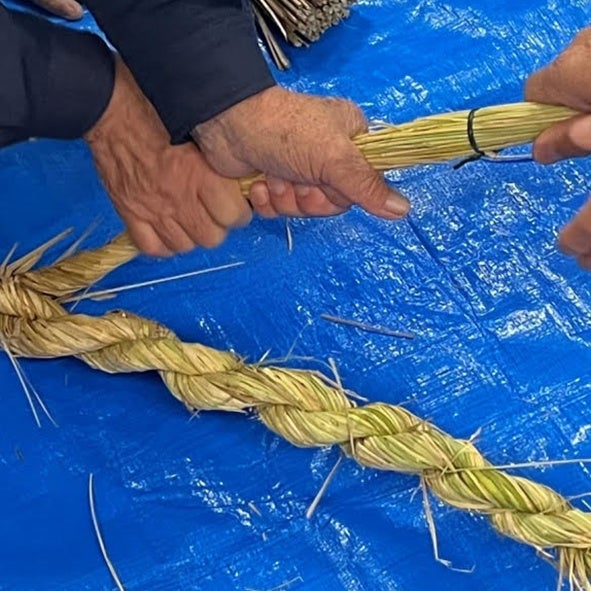 米を収穫したあとの稲わらは、さまざまな形で利用されます。稲わらを使って、縄をなってみましょう。
