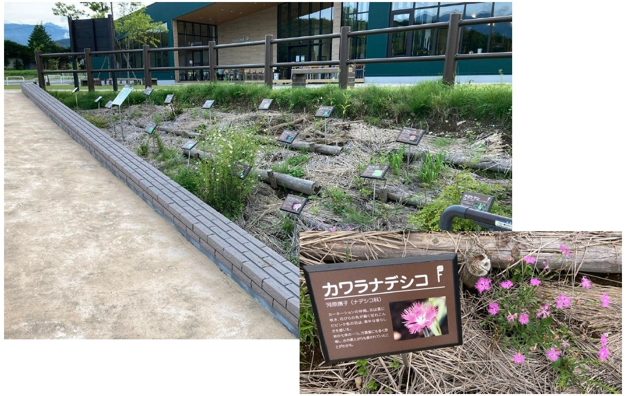 カゴメ野菜生活ファーム富士見では、地域の在来植物の種子や株を45種採取し、育苗し、法面に植栽しています。法面に植栽した45種の在来植物の一部を見本園で紹介しています。