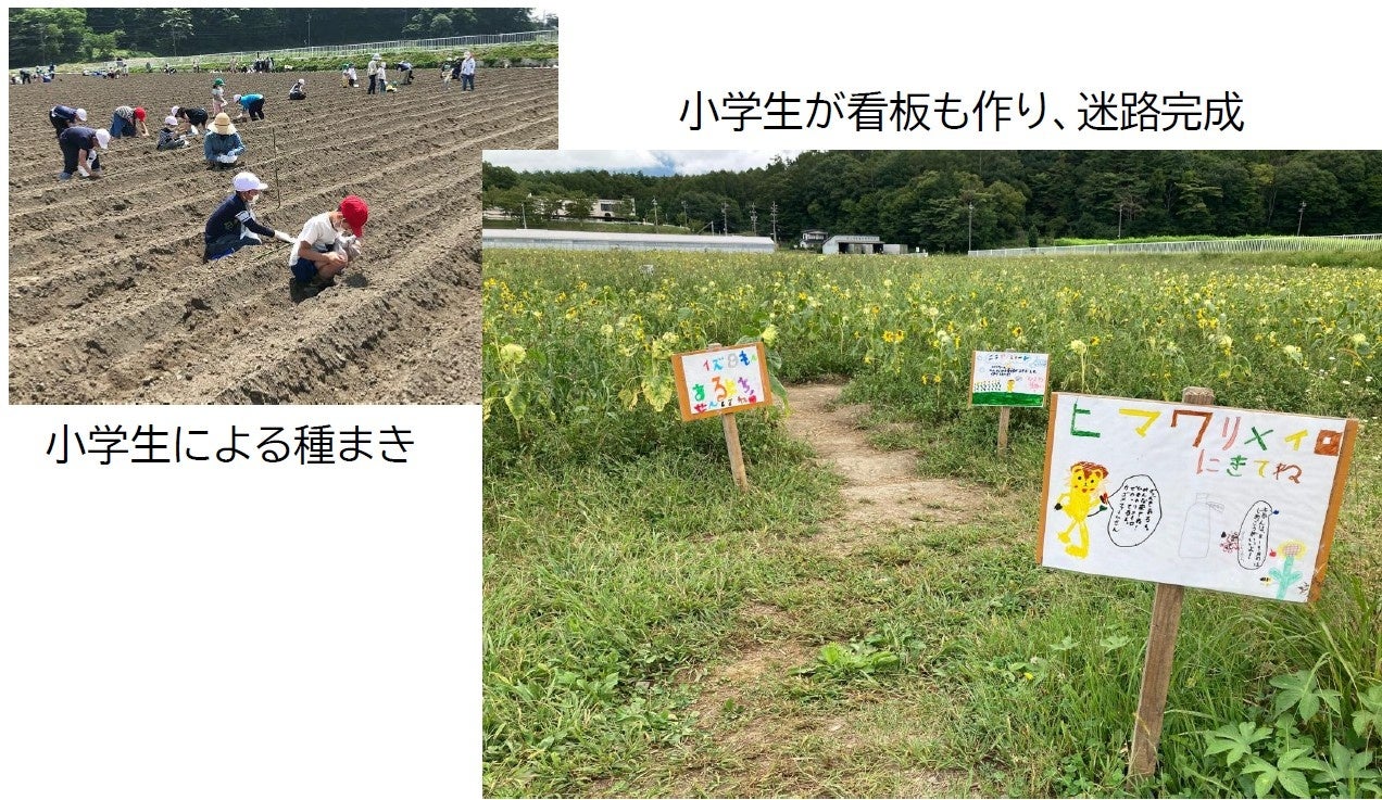 小学生が迷路を設計し播種し、看板も子供たちが作成し、ヒマワリを使った迷路を設置しています。