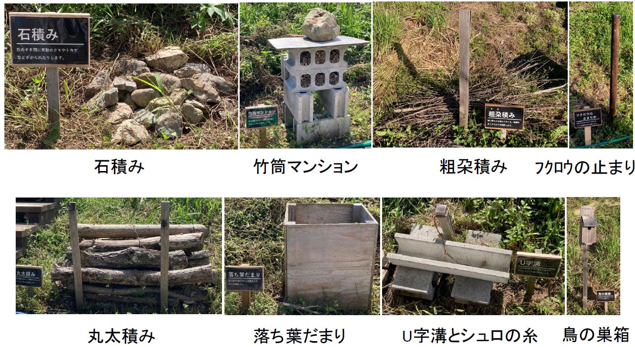 カゴメ野菜生活ファーム富士見では、持続的な農業を具現化するため、隣接する 1.2ヘクタールの畑に「生きものと共生する農場」を設置しています。この農場は、様々な生きものが畑の周りで生活しやすい環境にする仕掛けや、害虫の天敵など、農業に役立つ生きものを畑に呼び込み、生きものの力を活かした農業を行う仕掛けを設置しています。このさまざまな仕掛けを1か所に集めて紹介しています。