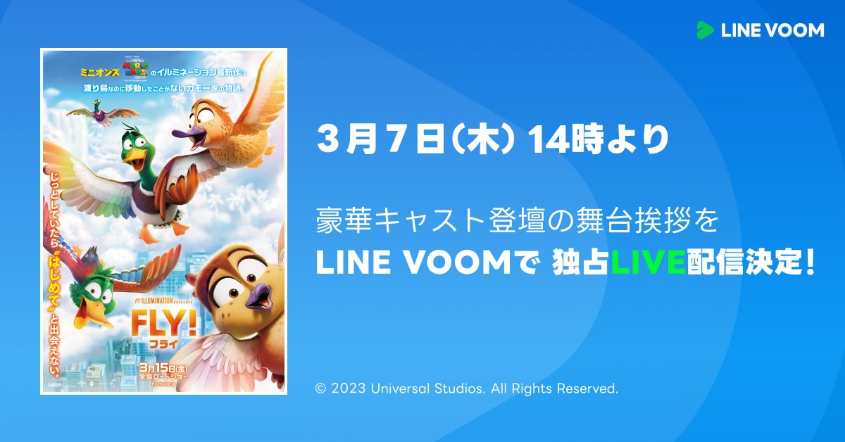 LINEヤフー株式会社は、「LINE」内の動画プラットフォーム「LINE VOOM」にて、映画『FLY!/フライ!』の舞台挨拶に加え、吹き替えキャストによるスペシャルアフタートークを2024年3月7日(木)にライブ配信します。