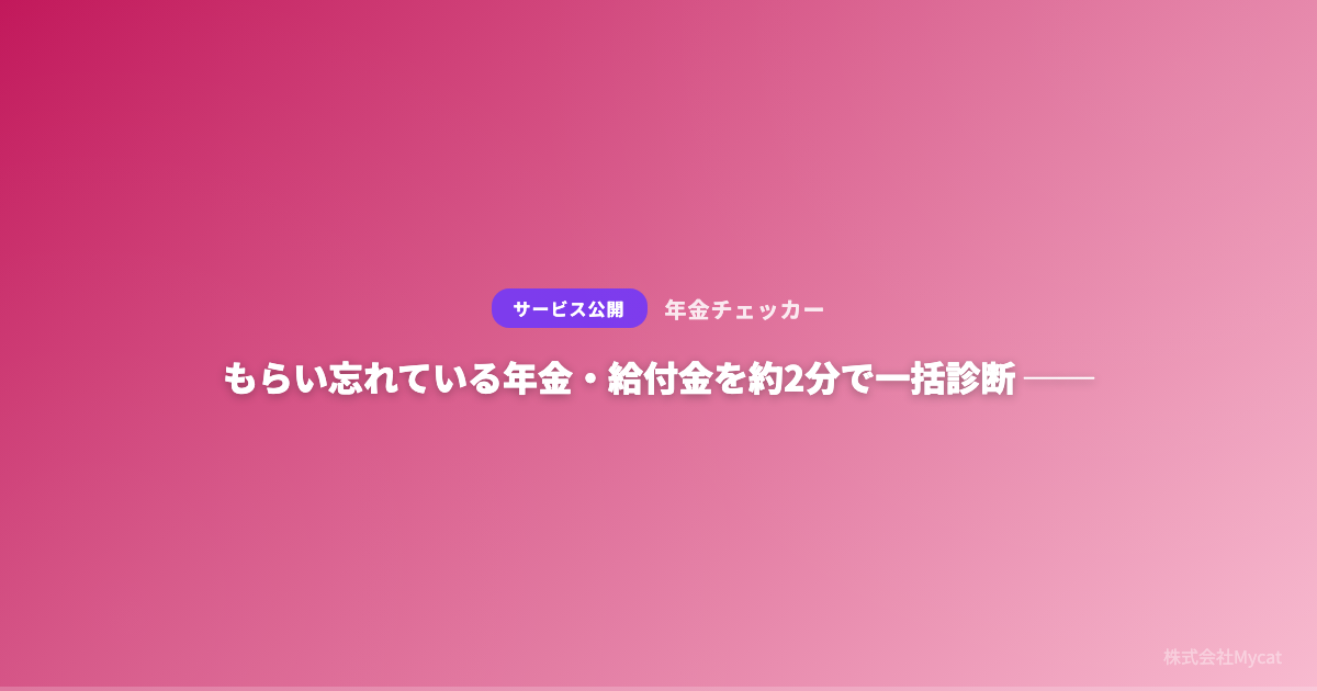 株式会社Mycatは、申請しなければ受け取れない年金・給付金の受給可能性を一括診断する無料Webツール「年金チェッカー」(https://nenkin.xyz)を公開した。