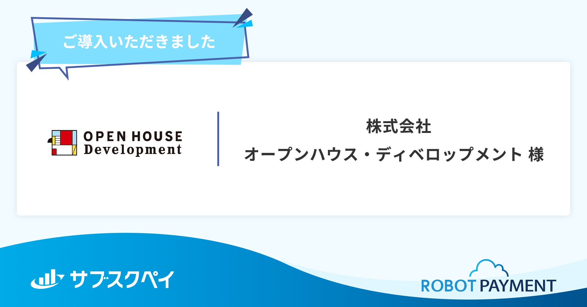 株式会社ROBOT PAYMENT(本社:東京都渋谷区、代表取締役:清久 健也、以下「ROBOT PAYMENT」)は、顧客管理・自動課金クラウド「サブスクペイ」が、株式会社オープンハウスグループのグループ会社である株式会社オープンハウス・ディベロップメント(以下「オープンハウス・ディベロップメント」)に導入されたことをお知らせします。