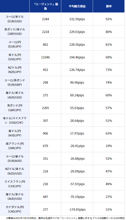 5~7月の通貨ペア別TOP100「エージェント」総合損益