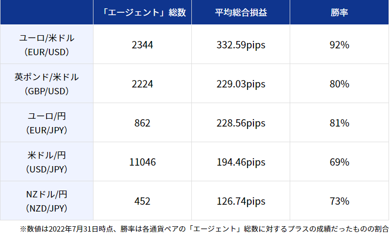 TOP100「エージェント」とは毎月末に算出する年間総合損益上位100位以内の「エージェント」のことで、それぞれの通貨ペアで選出しています(月末の年間損益に応じて、「エージェント」は毎月入れ替えられます)。