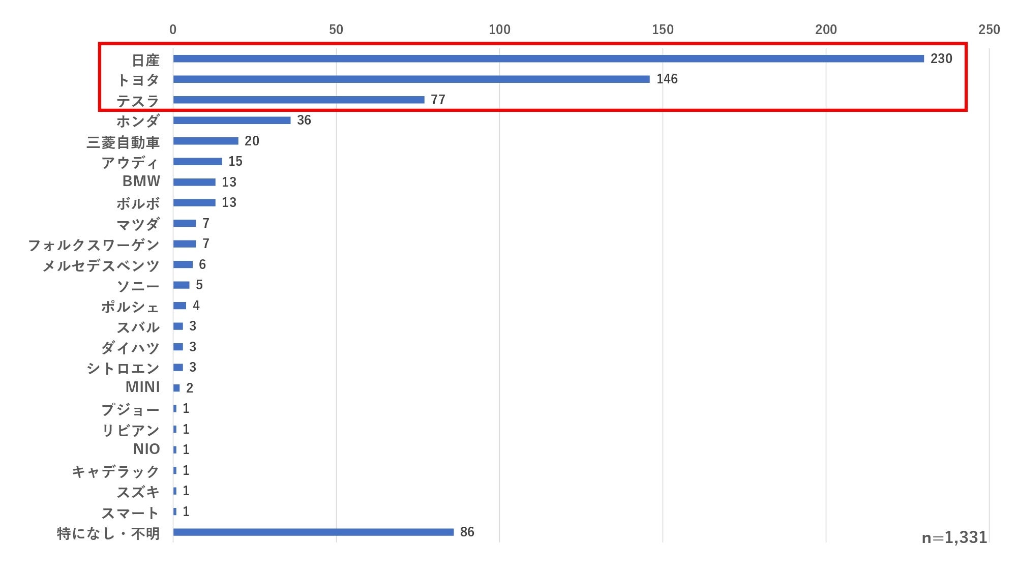 「日産」「トヨタ」「テスラ」をはじめ、国内外のメーカー、車名が多く挙げられた。