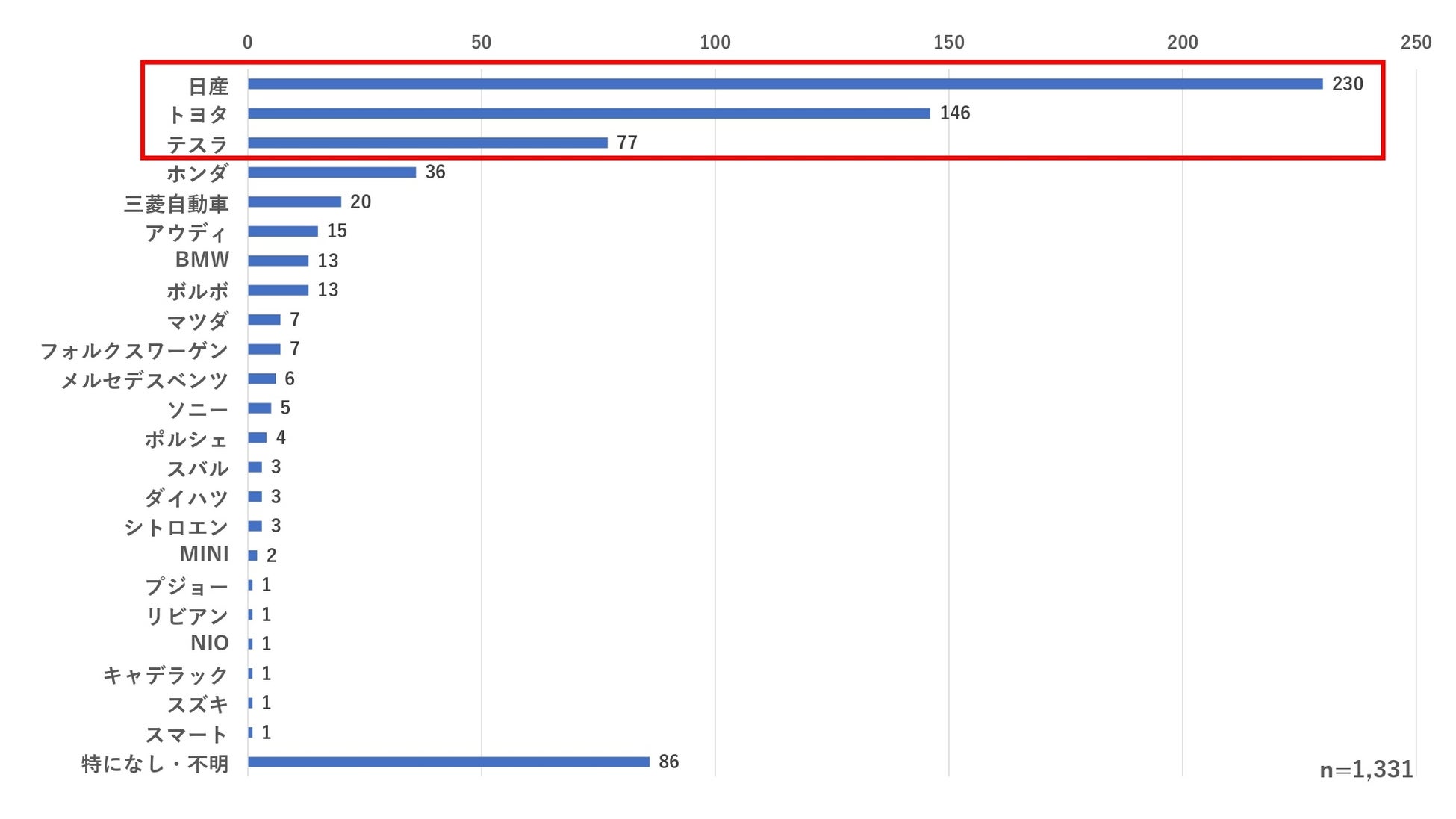 ・また、電気自動車(EV)において特に興味がある(もしくは所有している)メーカーや車名においては