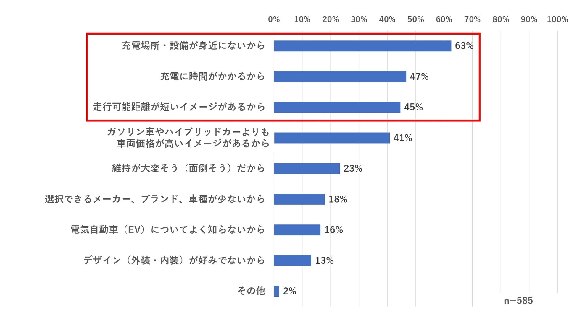 一方で、「電気自動車(EV)に興味がない」と答えた人からはその理由として「充電場所・設備が身近にないから」、「充電に時間がかかるから」、「走行可能距離が短いイメージがあるから」などの回答が多く、電気自動車の充電インフラ拡充に対する課題も見られました。
