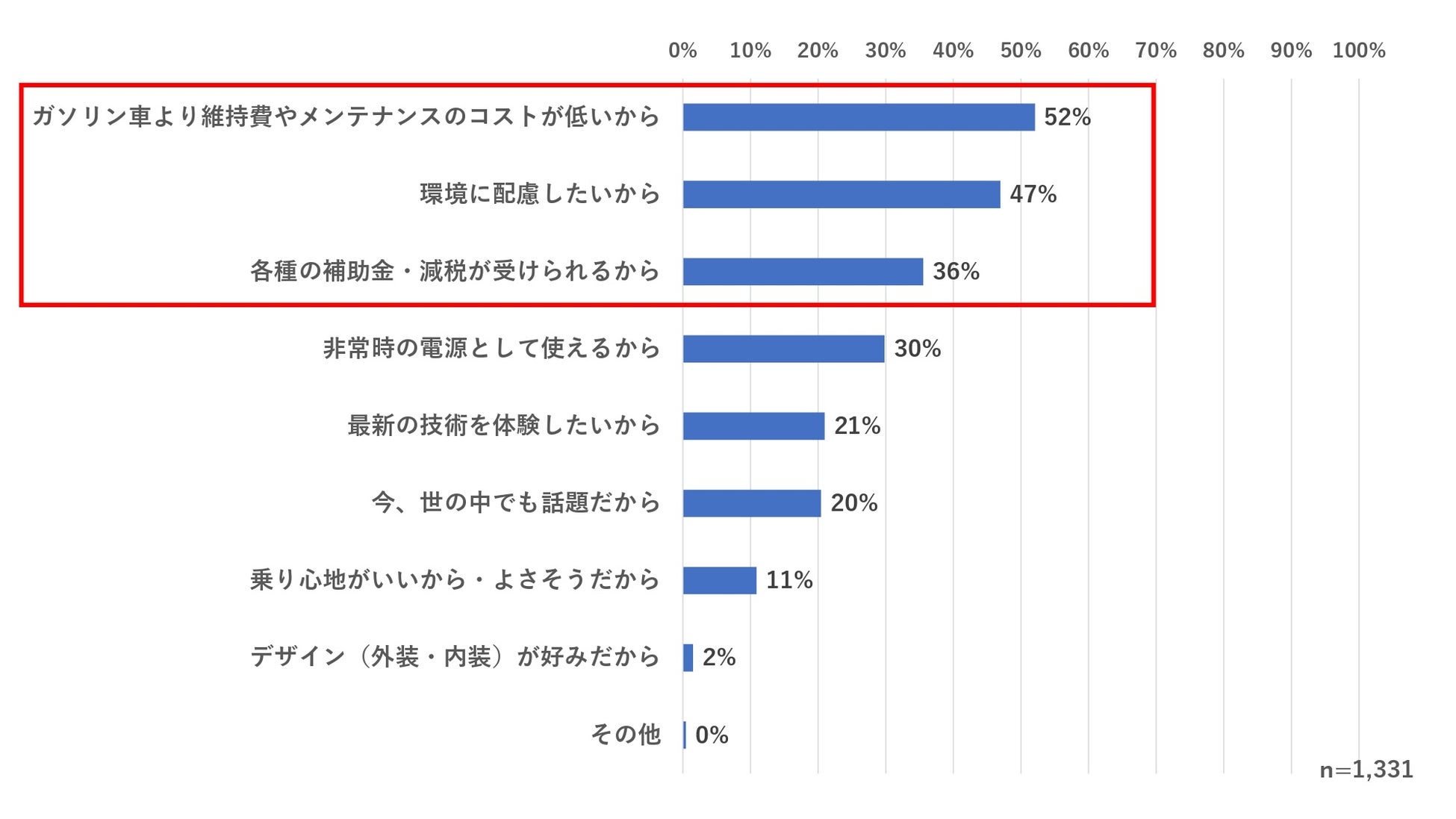 Q.「電気自動車(EV)に興味がある」と答えた方にお伺いします。その理由を教えてください。(複数回答)