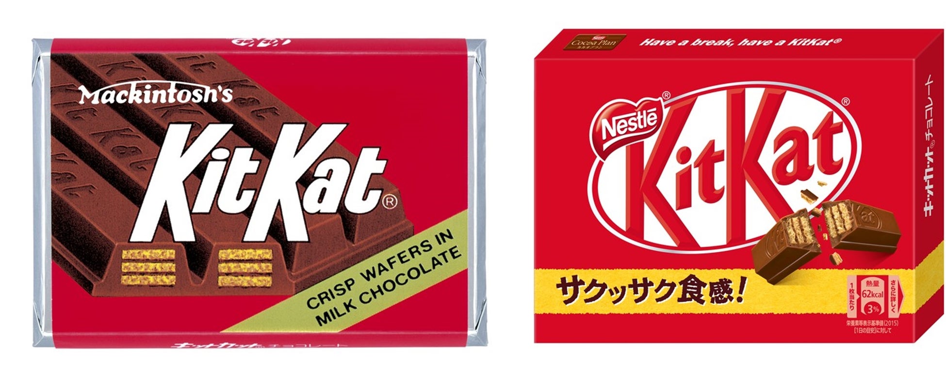 画像(左より):製品パッケージ(1973年発売時)、「キットカット ミニ 3枚」(現在発売中)