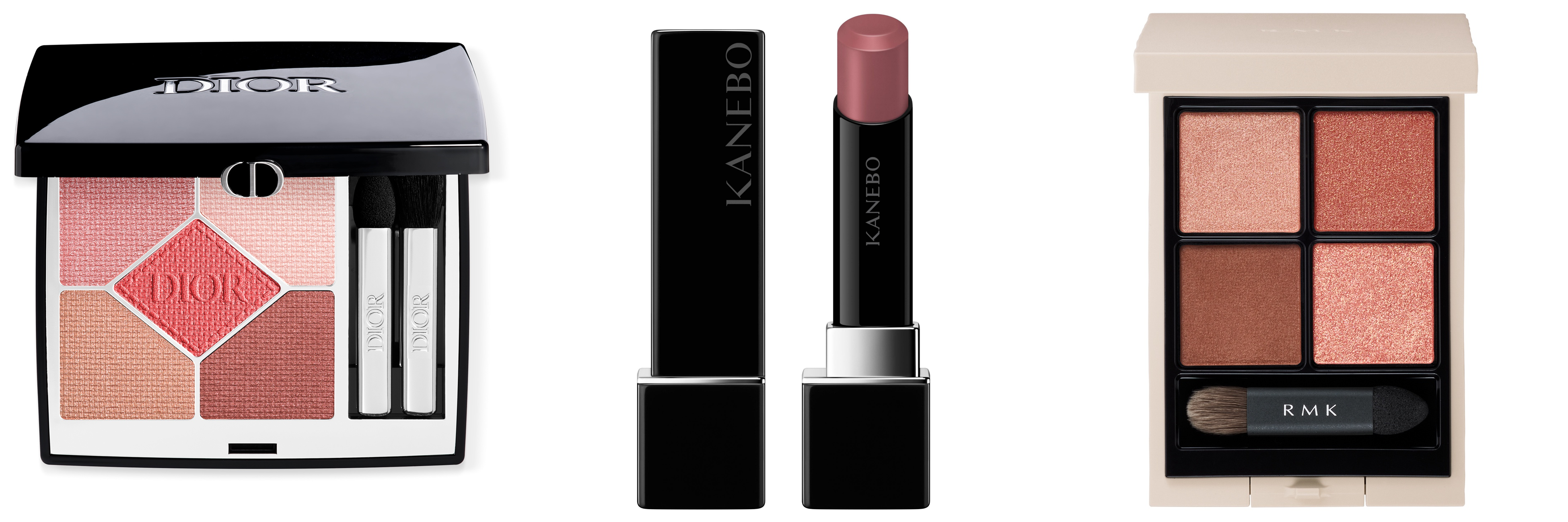 左から:ディオール「ディオールショウ サンク クルール / 923 ポプリン ピーチ」、KANEBO「ルージュスターヴァイブラント / V02」、RMK「RMK シンクロマティック アイシャドウパレット / 05 ディライトフル」