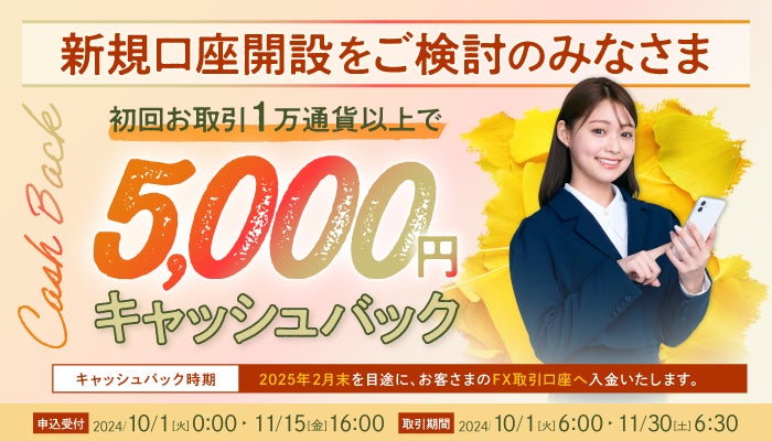 10月に新しく口座開設いただいたお客さまを対象に、初回お取引1万通貨以上でもれなく5,000円をキャッシュバック、さらに期間中のお取引数量に応じて、最大100万円をキャッシュバックいたします。