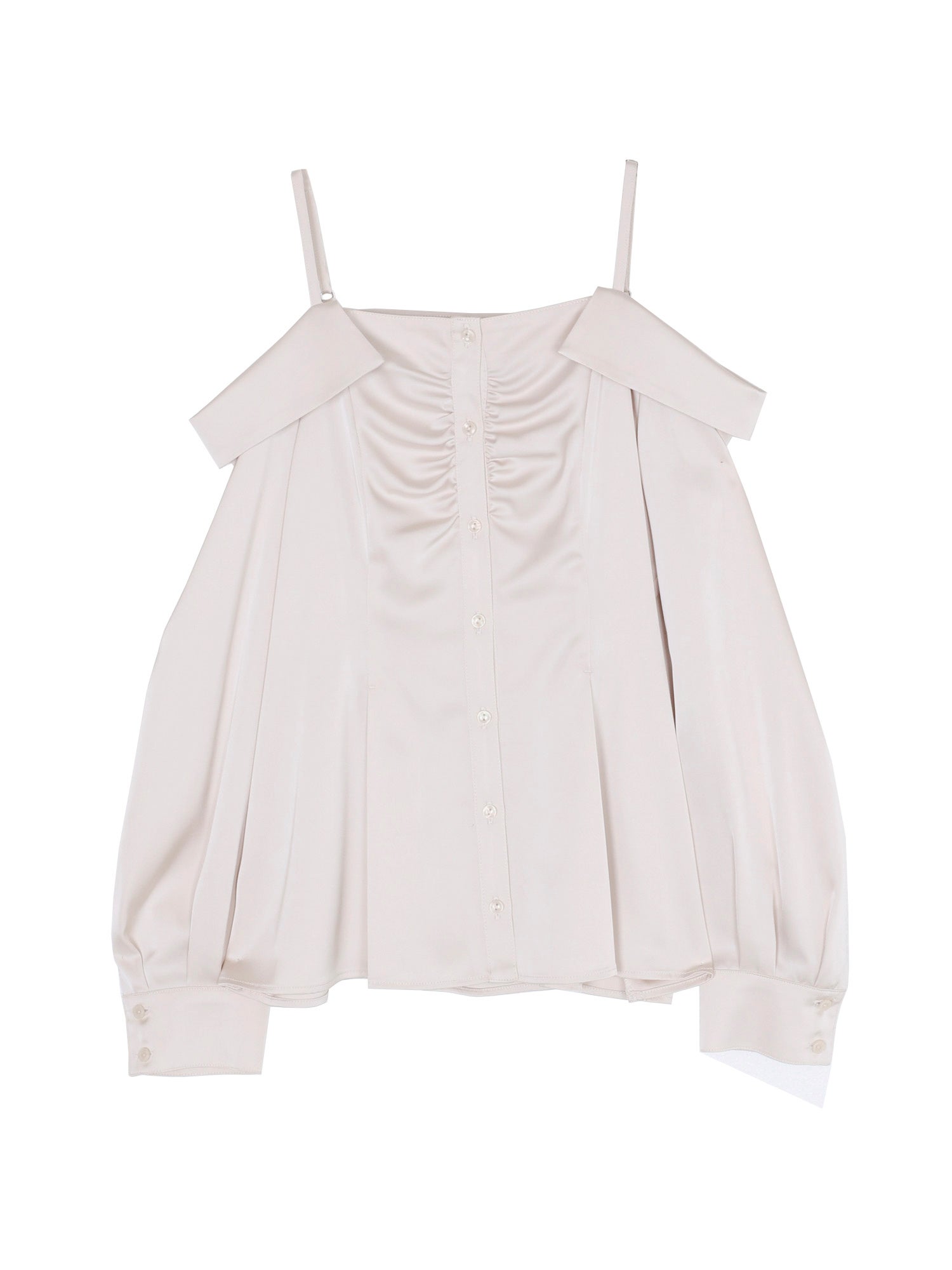 オフショルデザインにシャツカラーを組み合わせた新鮮なデザインが魅力のブラウス。