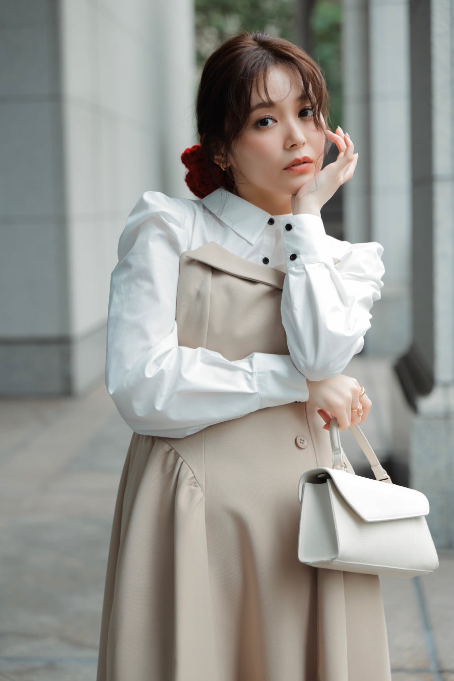 コントラストの効いたシャツ部分のボタンがマニッシュなアクセントに。