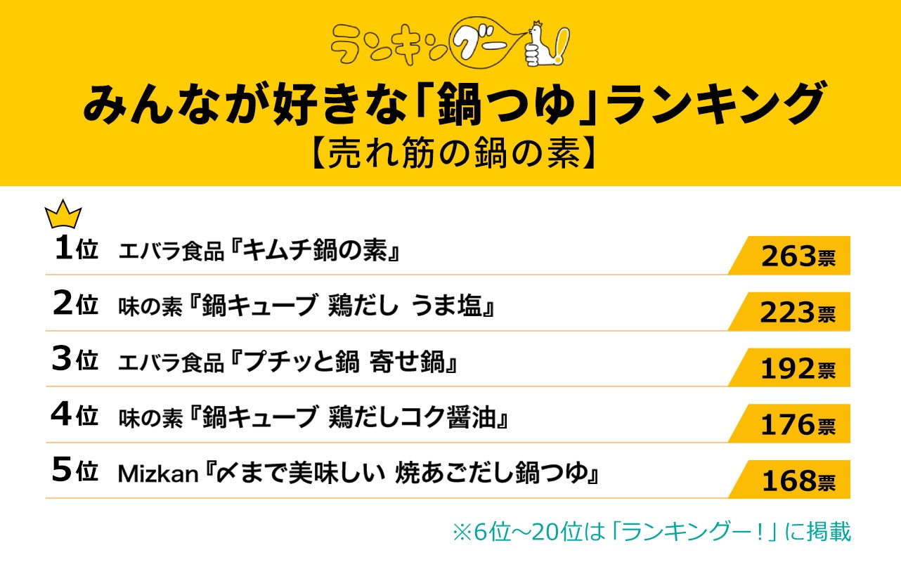 ランキングー!ではみんなが好きな「鍋つゆ」をピックアップし、ランキングを調査。10~50代の男女(性別回答しないを含む)4,677名にアンケートを行い、TOP20を決定しました。ここではTOP5をご紹介します。
