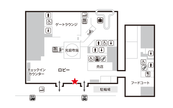 手荷物受取所を背に真っすぐ進み、売店を通り越した先にある出入口付近、駐車場精算機の右あたりへの設置となります。