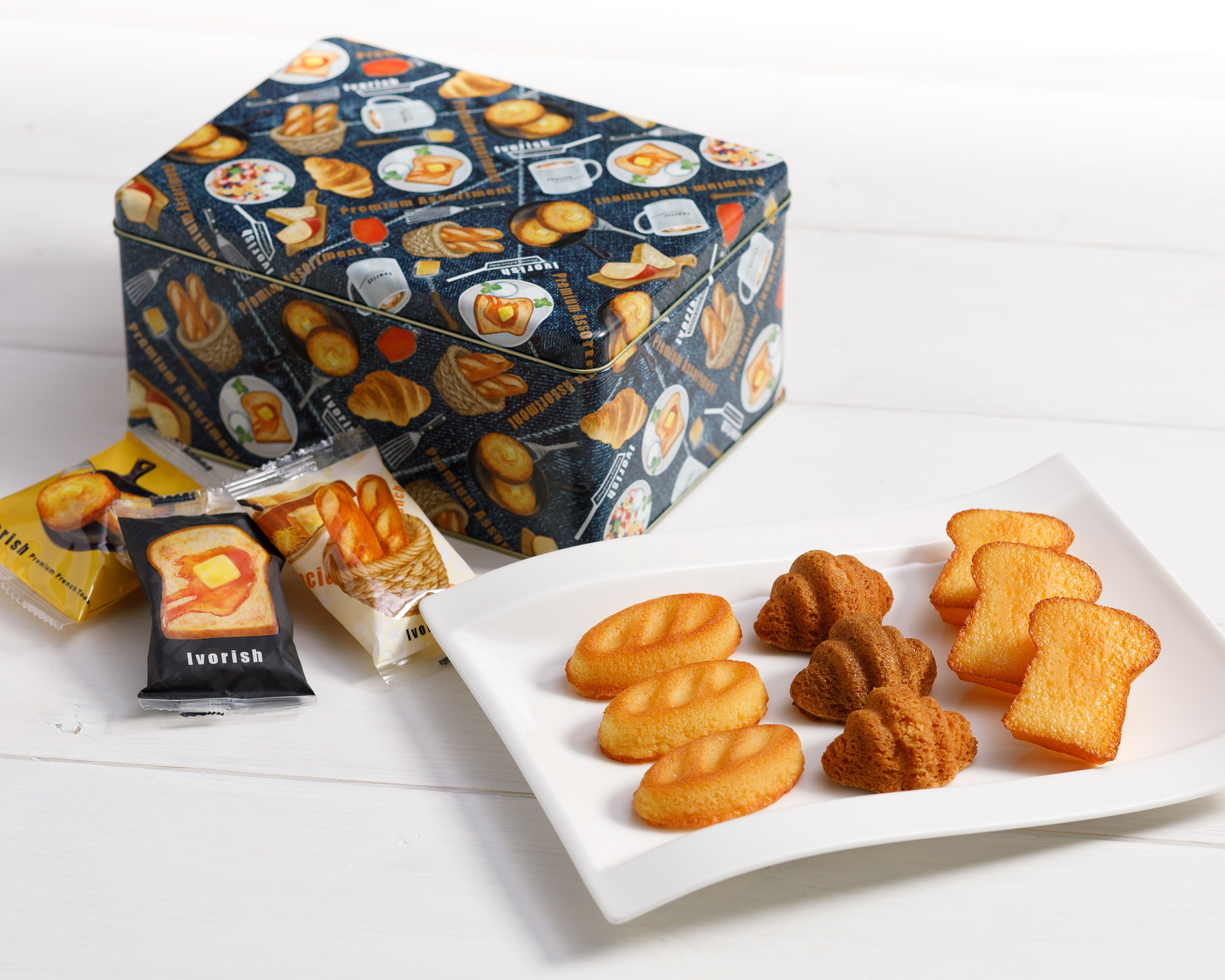 ⼩さなパン型がキュートな「フレンチトーストフィナンシェ」はもちろん、さまざまなメディアで紹介されたオリジナルデザイン⽸の「Ivorishプレミアムアソート」をラインアップ。旅のお⼟産はもちろん、⼤切な⽅へのギフトにもおすすめのアイテムが揃います。