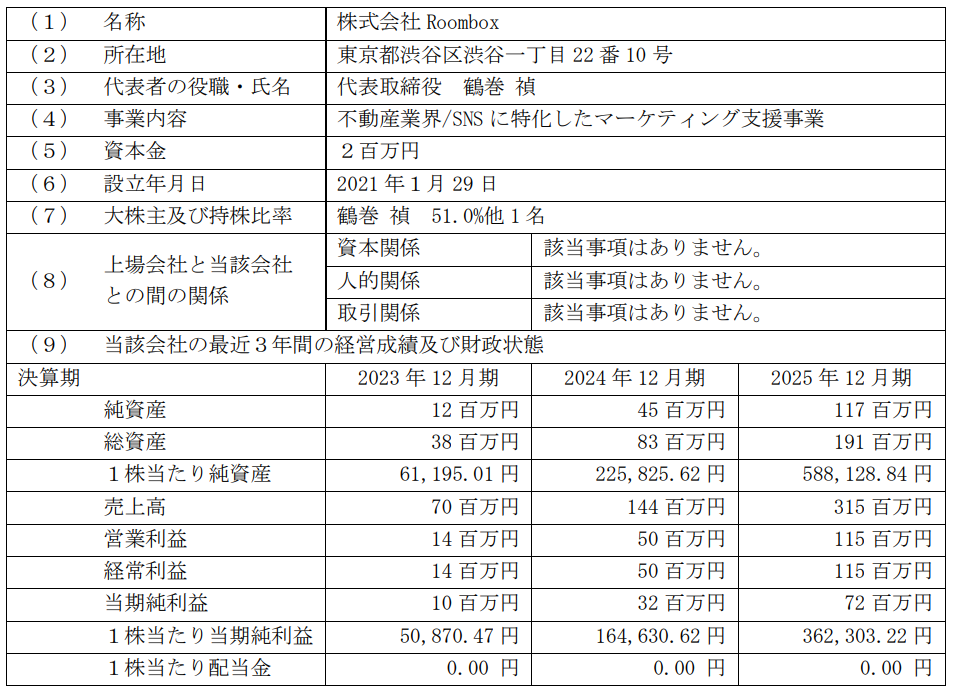 当社は、2026年4月27日開催の取締役会において、以下のとおり、株式会社Roombox(以下、RBX社)の株式を取得して連結子会社化することについて決議いたしましたので、お知らせいたします。