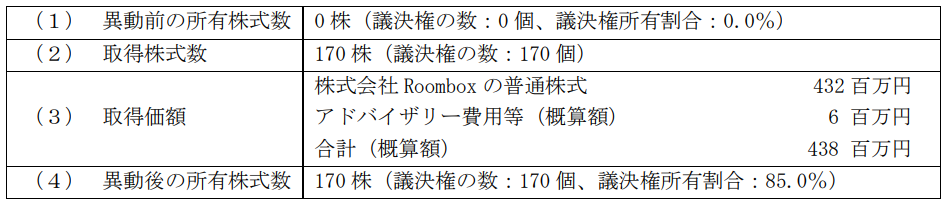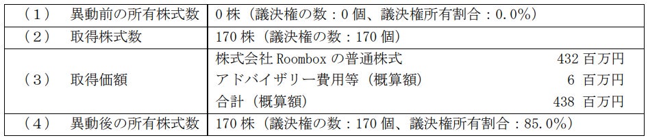 株式会社Roomboxの株式の取得(子会社化)に関するお知らせ