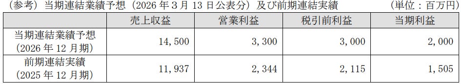 本件による連結決算上ののれん及びその他の無形固定資産等の計上額並びに 2026 年 12 月期の連結業績予想に与える影響については現在精査中であり、株式取得が完了した後に、判明次第速やかにお知らせします。