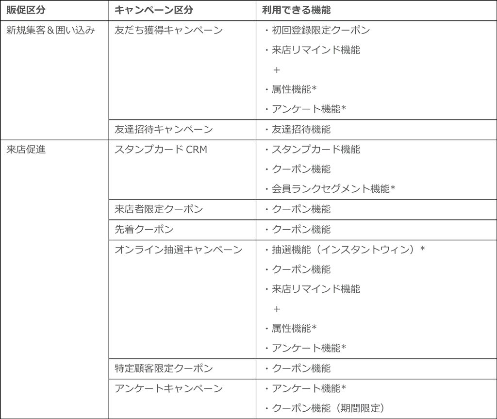 ■管理画面で選べる販促施策例(やりたい販促施策に応じて利用機能を自動で提案)