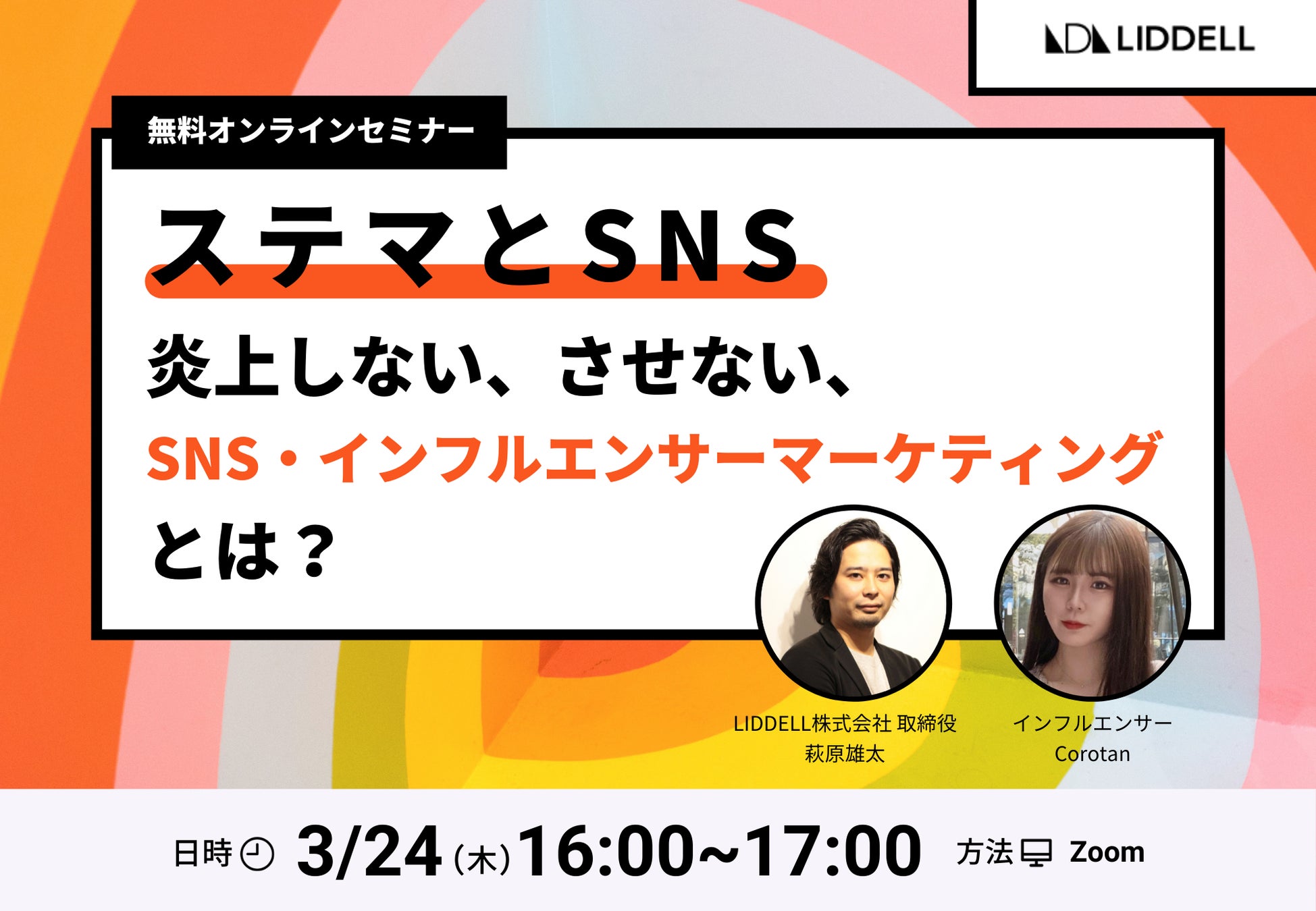 インフルエンサーマーケティング事業を展開するLIDDELL株式会社(本社:東京都港区、代表取締役:福田 晃一、以下リデル)は、2022年3月24日(木)16:00~17:00に、 無料オンラインセミナー「ステマとSNS。炎上しない、させない、SNS・インフルエンサーマーケティングとは?」 を開催致します。