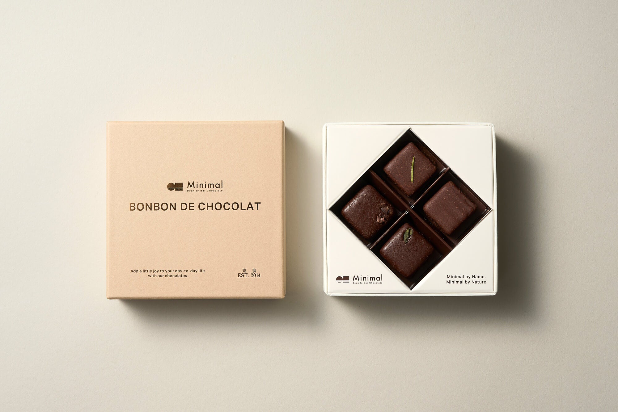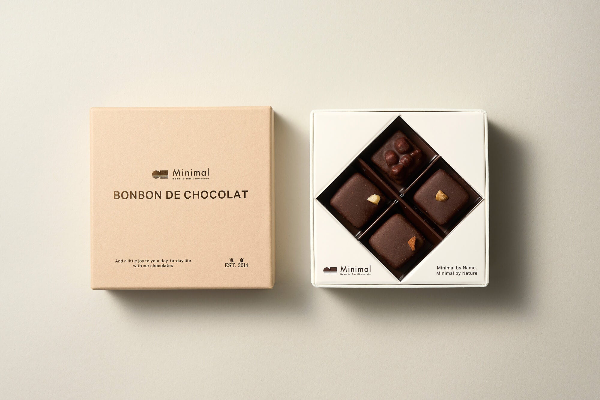 Minimal は世界のカカオ産地を訪れ良質なカカオ豆から職人が一つ一つ手仕事でチョコレートの製造をしています。「丁寧にシンプルに、最高の素材を活かし香りを最大限に引き出す」という原点に真摯に、国内外の星付きレストランやトップパティスリーで腕を磨いてきたパティシエ・ショコラティエ・職人達が切磋琢磨し、チームワークでMinimalのチョコレートやスイーツをつくります。
