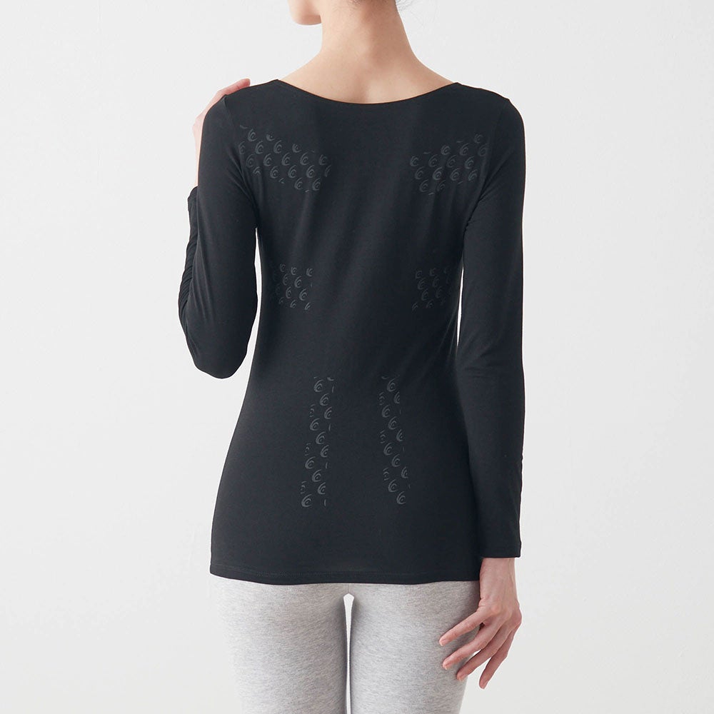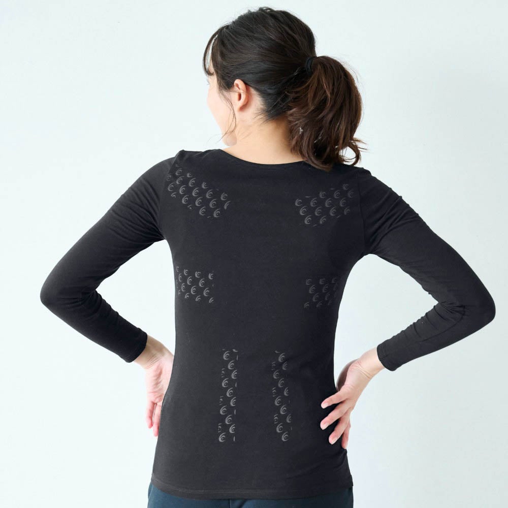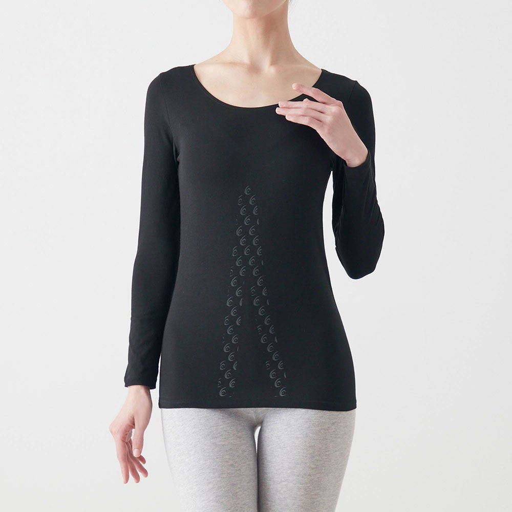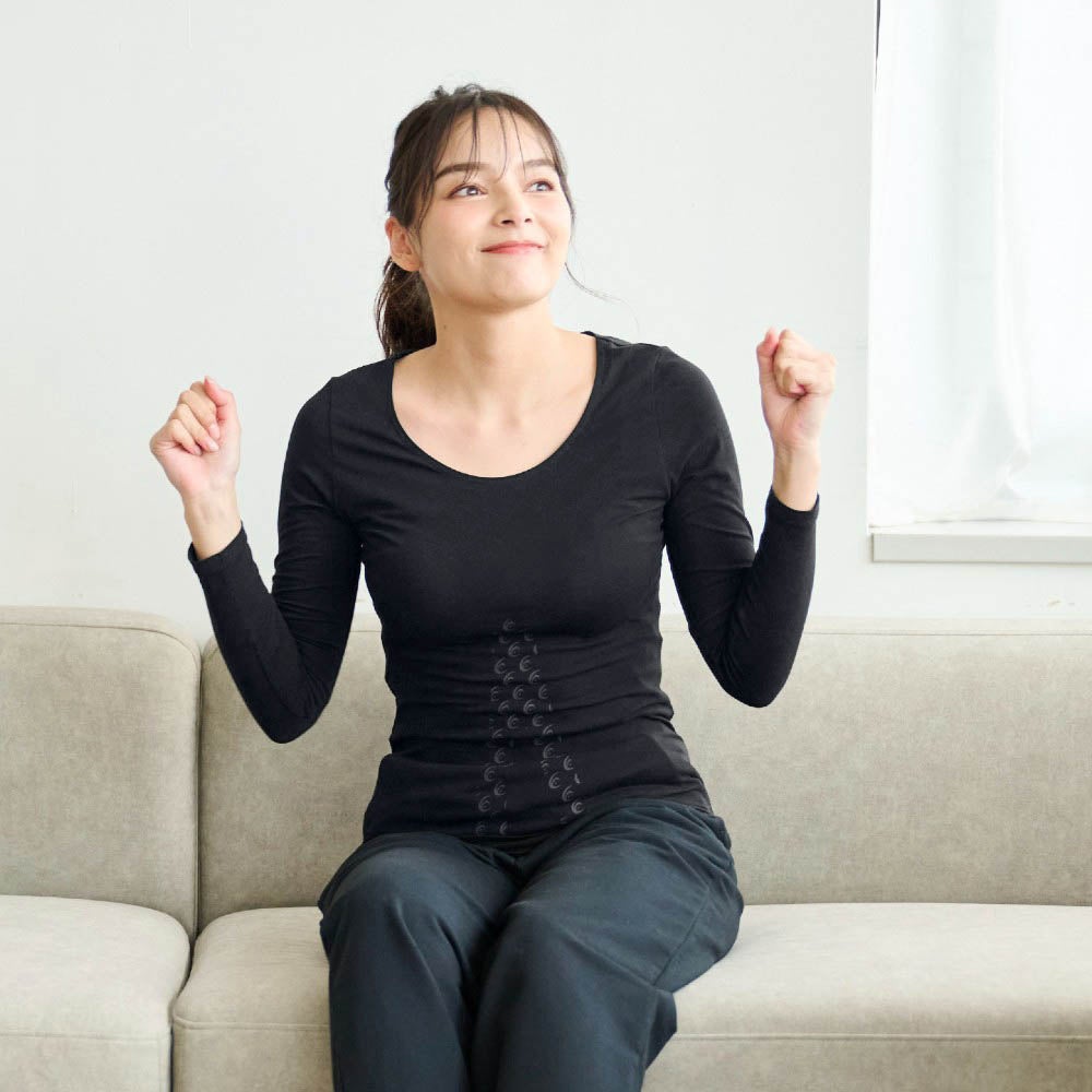 血行を促進し、身体をサポートするRELIVEの独自加工と、しなやかで肌ざわりのよい綿95%の「ホットコット」が初めてコラボレーションしたインナーが完成しました。背中が出にくい長め丈で、吸湿発熱素材により薄手でもあたたかさを感じる着用感を叶えました。冬の日常を快適にサポートする一着です。