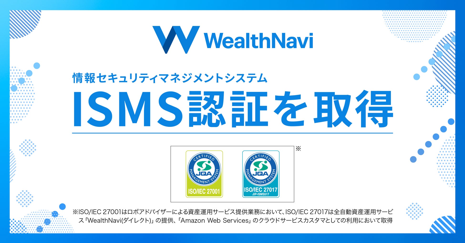 預かり資産・運用者数 国内No.1ロボアドバイザー(※1)「WealthNavi(ウェルスナビ)」を提供するウェルスナビ株式会社(本社:東京都渋谷区、代表取締役CEO:柴山和久、以下「当社」)は、2024年7月26日付で、情報セキュリティマネジメントシステム(以下、ISMS)の国際規格である「ISO/IEC 27001」認証と、ISMSクラウドセキュリティの国際規格である「ISO/IEC 27017」認証を取得しました。今後も、情報セキュリティ体制の改善と強化を続け、お客様に安心してサービスをご利用いただくための取り組みに尽力します。