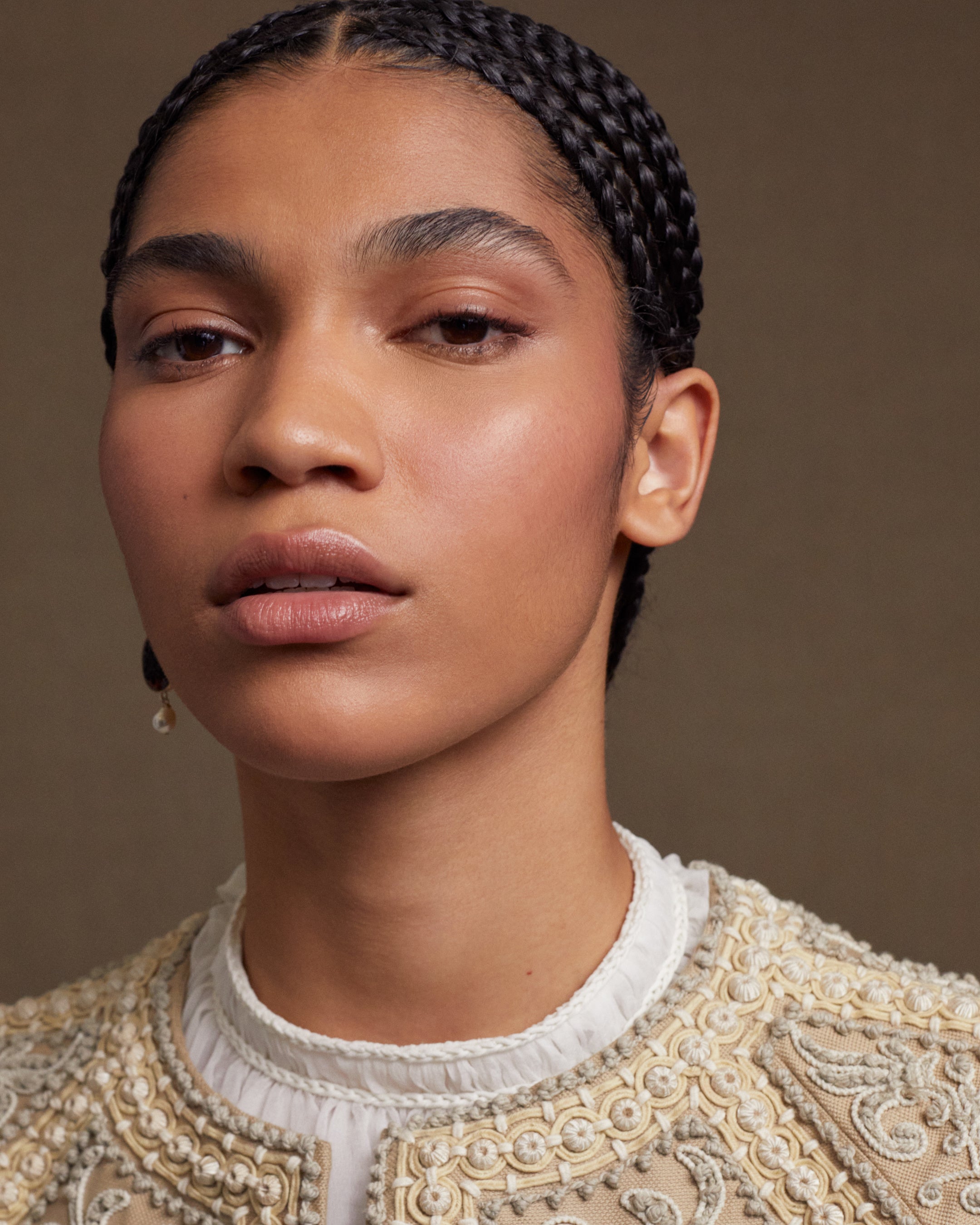 「光とツヤが強調されるようなルックを作り上げました。肌に絶妙に溶け込むようなヌードトーンがフェイス