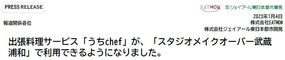 出張料理サービス「うちchef」を運営する株式会社EATMOWと株式会社ジェイアール東日本都市開発は業務提携し、ジェイアール東日本都市開発が管理・運営する複合施設「スタジオメイクオーバー武蔵浦和」での出張料理サービスを2023年1⽉13⽇(金)より開始します。