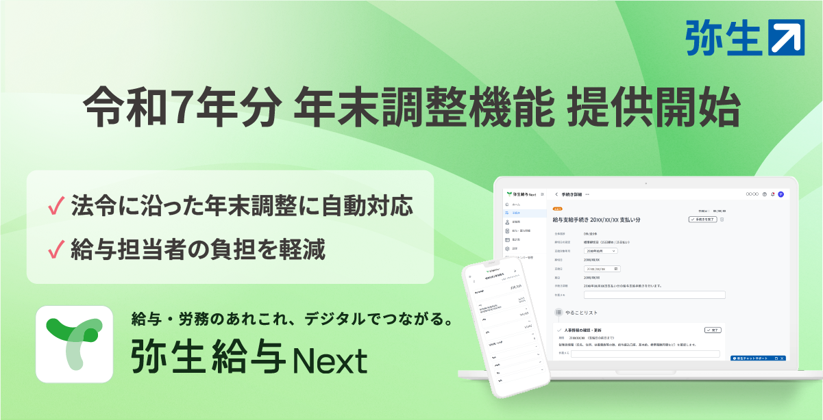 弥生株式会社(本社:東京都千代田区、代表取締役 社長執行役員 兼 CEO:武藤健一郎、以下「弥生」)は、クラウド給与サービス「弥生給与 Next」の令和7年分年末調整機能を10月30日(木)より提供開始しました。今回の年末調整機能は、令和7年度税制改正や各種申告手続きに対応し、より効率的な年末調整業務を実現します。