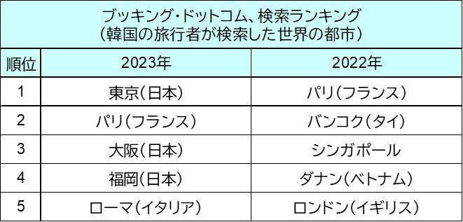 韓国の人々が最も検索した旅先のランキングを見ると、1位は東京となりました。2位以下は、パリ、大阪、福岡、ローマと続きます。上位5位以内に日本の3都市がランクインしており、秋夕期間の旅先として、日本の都市への注目が高まっていることがうかがえます。