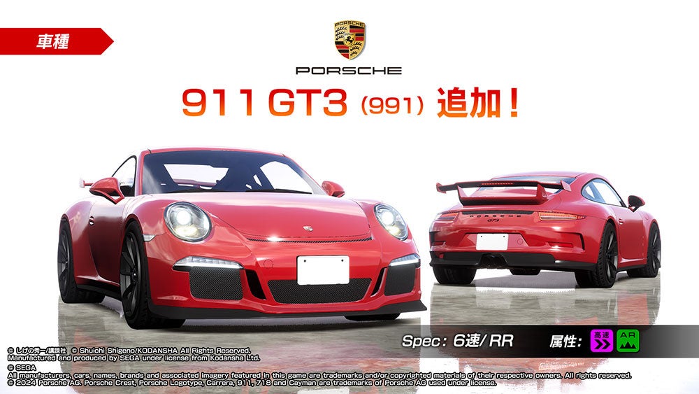 PORSCHEから「911 GT3(991)」、DAC初登場となる新メーカー「ALFA ROMEO」から「4C(96018)」が追加されました。Ver.2.6稼働と同時にスタートするTVアニメ『MFゴースト』コラボでも新規車種「911 GT3(991)」「4C(96018)」が登場します。