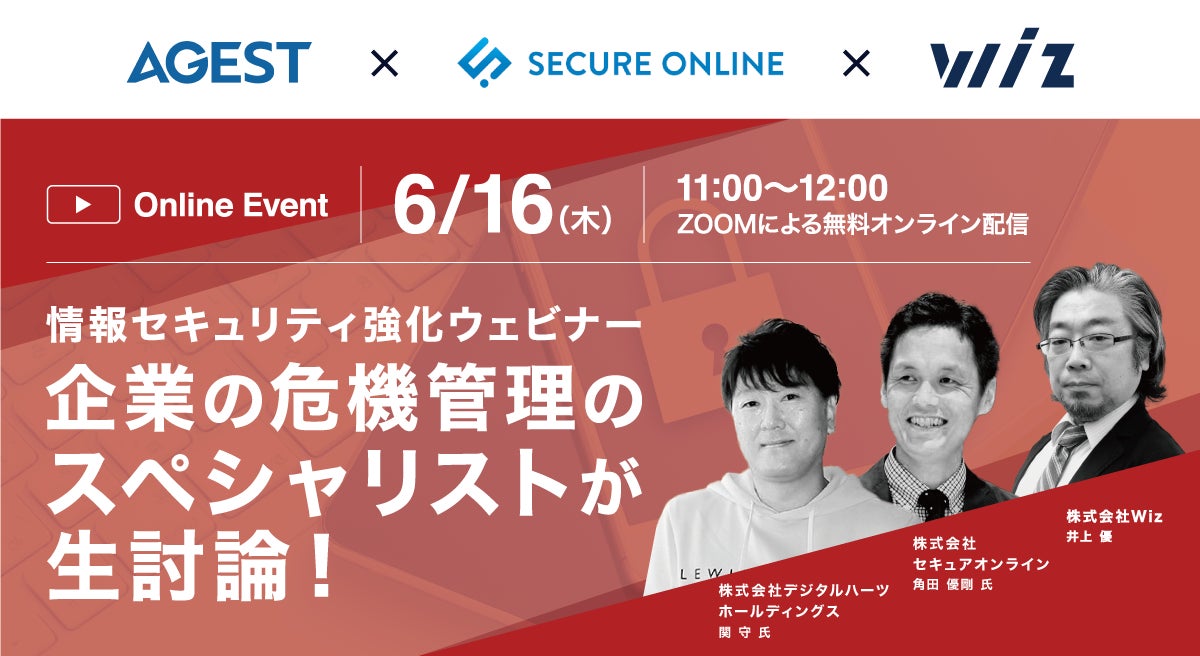 6月16日(木)、Wizは【株式会社デジタルハーツホールディングス執行役員CIO 兼 株式会社AGESTサイバーセキュリティ事業本部長 関 守 氏】【株式会社セキュアオンライン 代表取締役 角田 優剛 氏】をお迎えして、情報セキュリティ強化ウェビナーを無料開催します。