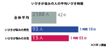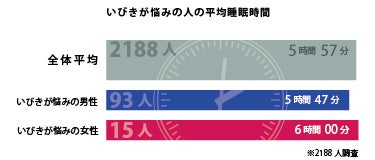 また、2188名全体の平均睡眠時間は5時間57分、平均いびき時間は42分ですが、いびきで悩む男性93名の平均睡眠時間は全体の平均よりも10分短い5時間47分、平均いびき時間は1時間19分にも及びました。それに対して、いびきで悩む女性15名は、平均睡眠時間が全体平均を少し上回る6時間00分、平均いびき時間は1時間03分となりました。女性は一般的に、女性ホルモンの影響で上気道の筋肉が緩みにくく、いびきをかく人が少ないとされています。